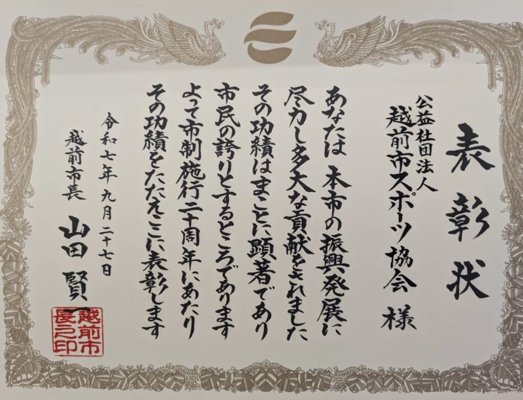 今回の表彰を励みに、今後も越前市のスポーツ振興にさらに貢献できるよう、努めてまいります。